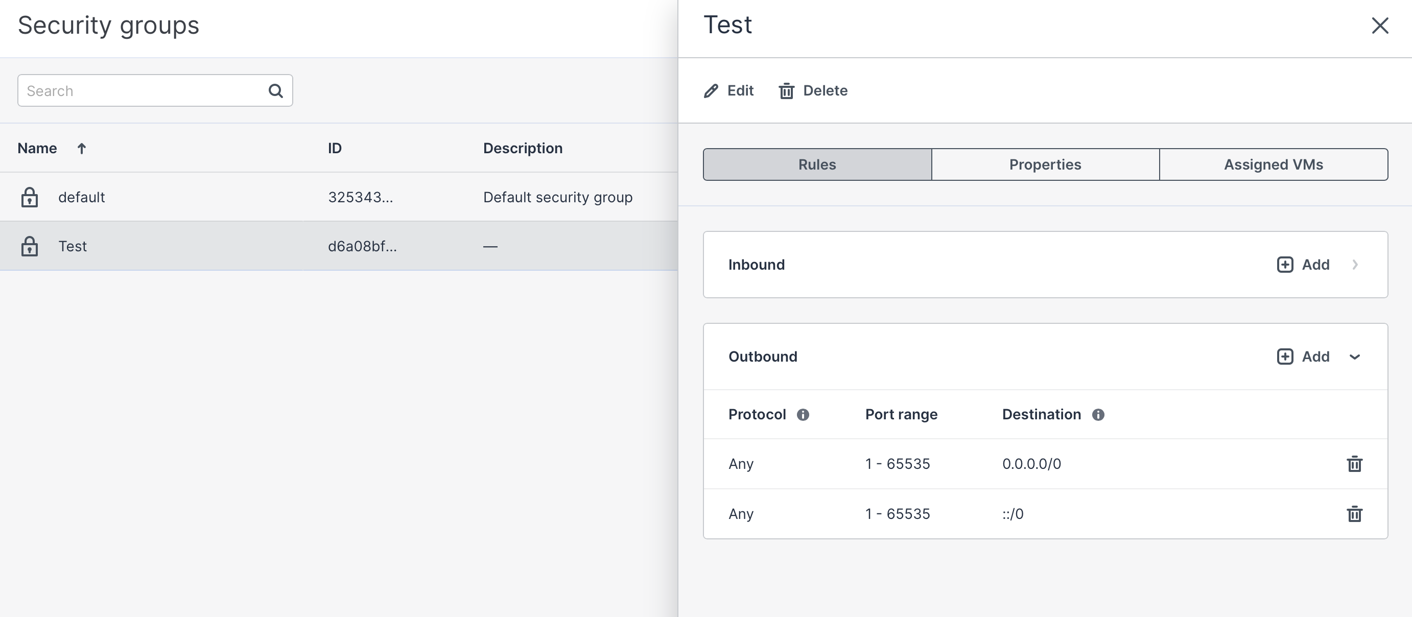 Domyślnie na liście znajdziesz grupę o nazwie default. Jest to podstawowa grupa, która zazwyczaj zezwala na cały ruch. Dla bezpieczeństwa zalecamy jednak tworzenie własnych grup z precyzyjnymi regułami.