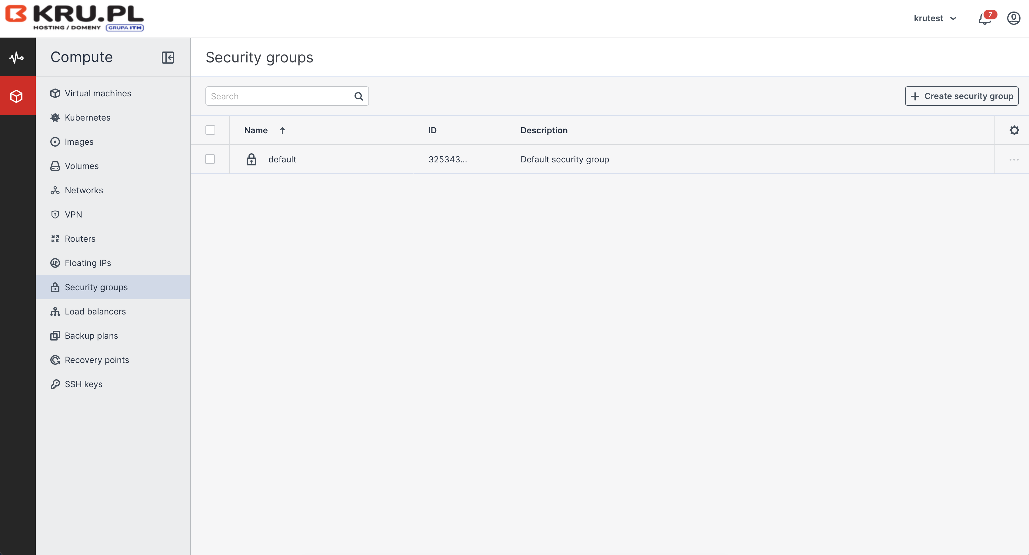 Zanim uruchomisz maszynę wirtualną, musisz zdecydować, kto może się z nią łączyć. W chmurze kru.pl nie musisz konfigurować skomplikowanych reguł wewnątrz systemu (np. iptables) – możesz użyć Security Groups (Grup Zabezpieczeń).