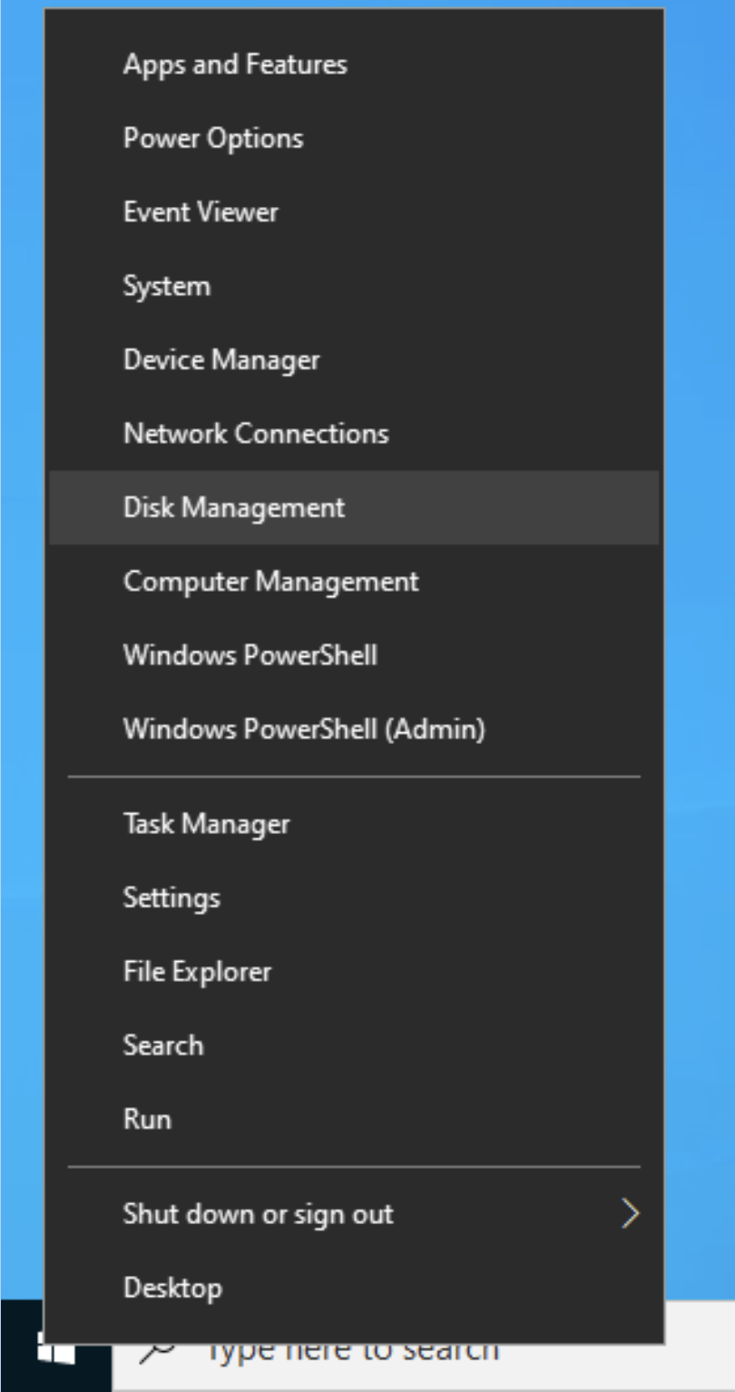 Wybierz z listy Disk Management (Zarządzanie dyskami).