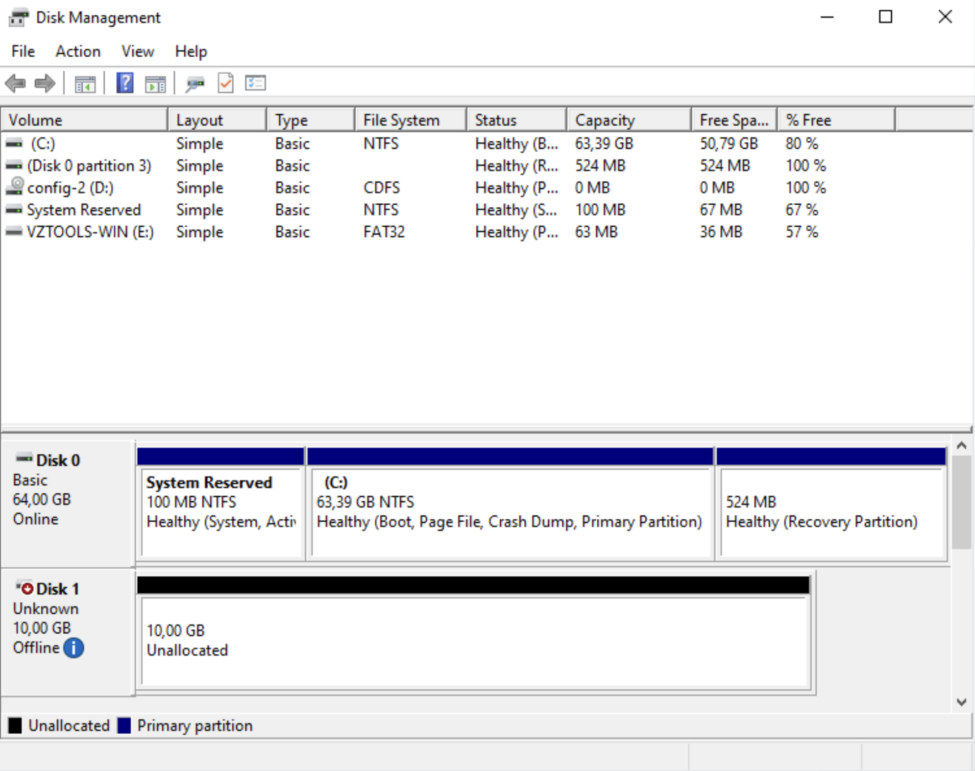 Po podłączeniu Wolumenu w Panelu Cloud, system Windows Server wykrywa go jako dysk w stanie "Offline". Aby pojawił się w "Mój Komputer", musisz go zainicjować.