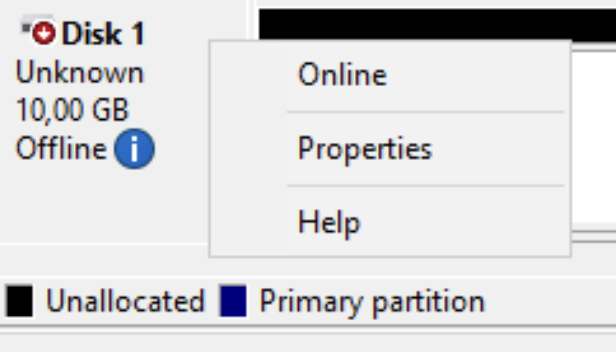 Jeśli dysk jest Offline – kliknij na nazwę "Disk 1" prawym przyciskiem i wybierz Online.