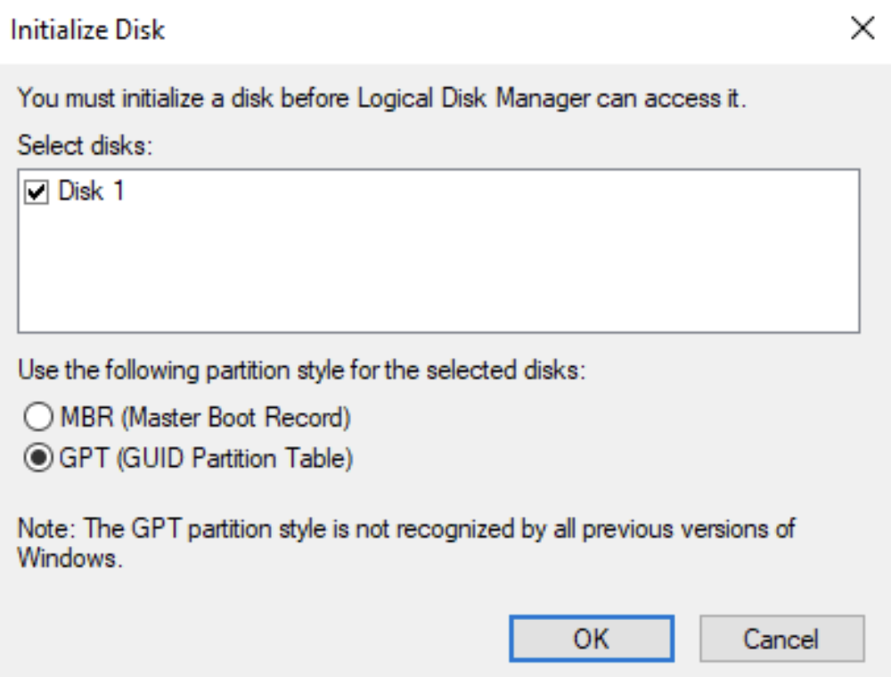 Jeśli dysk jest Not Initialized – kliknij prawym przyciskiem i wybierz Initialize Disk.